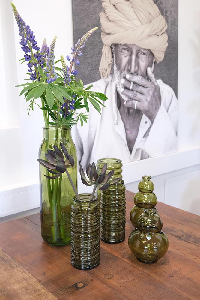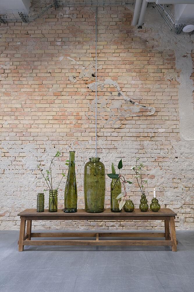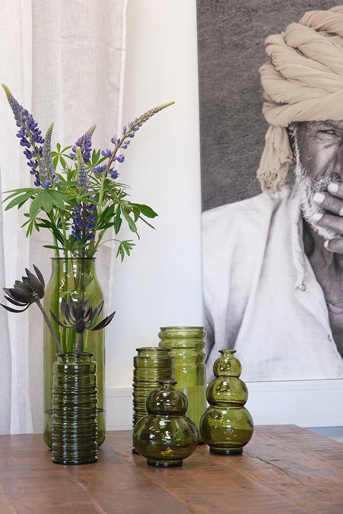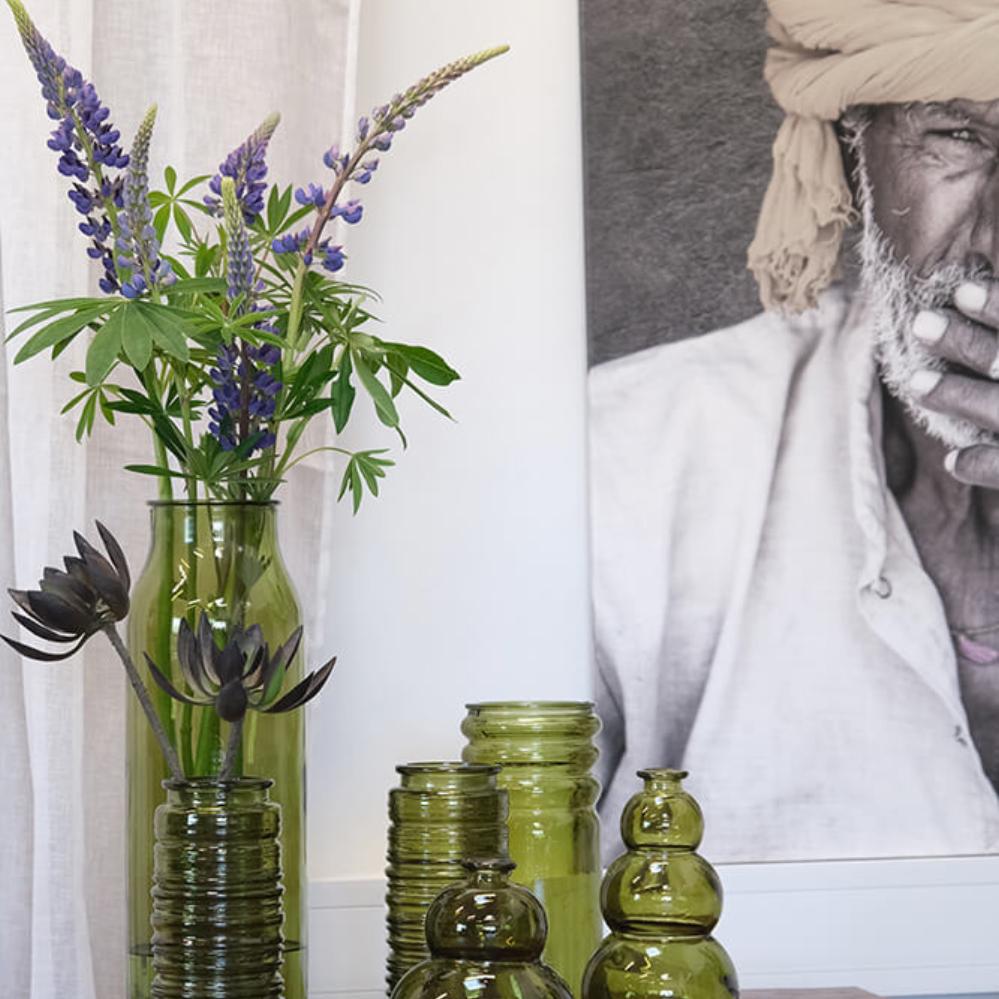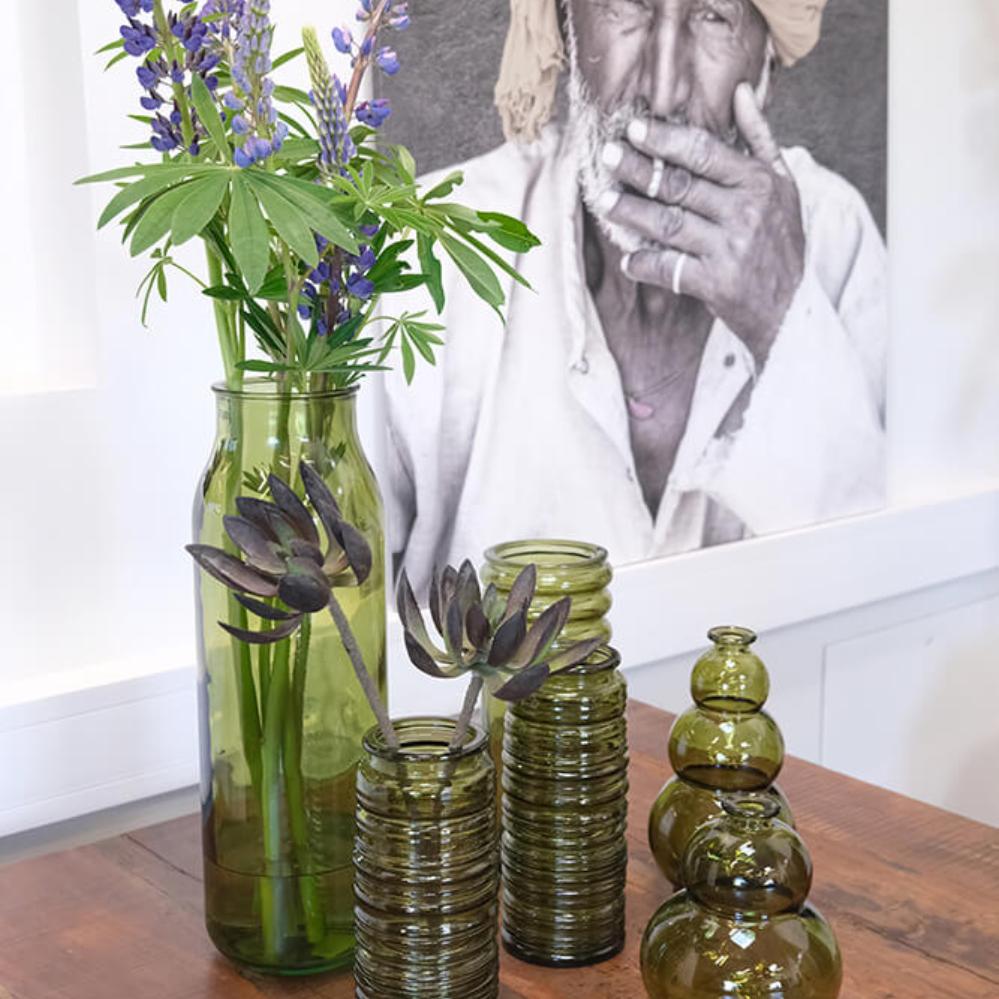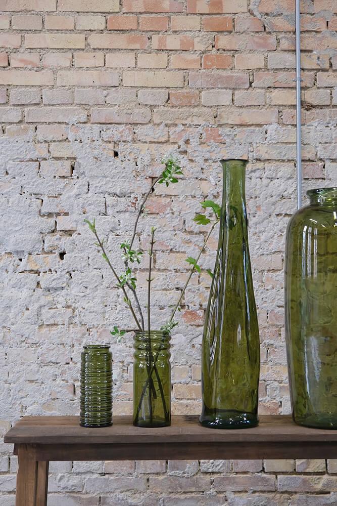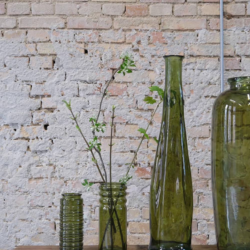 Die Robbie Vase aus olivgrünem Recyclingglas strahlt natürliche Eleganz aus. Der tiefe Grünton bringt Wärme und Ruhe, während die gerillte Oberfläche Struktur und Charakter verleiht. Es ist die Art von Vase, die nicht um Aufmerksamkeit bittet – und sie dennoch bekommt. Durch das recycelte Glas hat jede Vase ihre eigene Oberfläche mit kleinen Variationen und Bläschen, die daran erinnern, dass wahre Schönheit nicht perfekt sein muss. Verwenden Sie die Vase in Ihrem Restaurant, um eine organische und natürliche Atmosphäre zu unterstreichen. Oder stellen Sie sie in Ihr Wohnzimmer mit Trockenblumen, großen Blättern oder Zweigen. Eine robuste und charmante Vase, die sich sowohl in rustikale als auch in klassischere Umgebungen wunderbar einfügt.