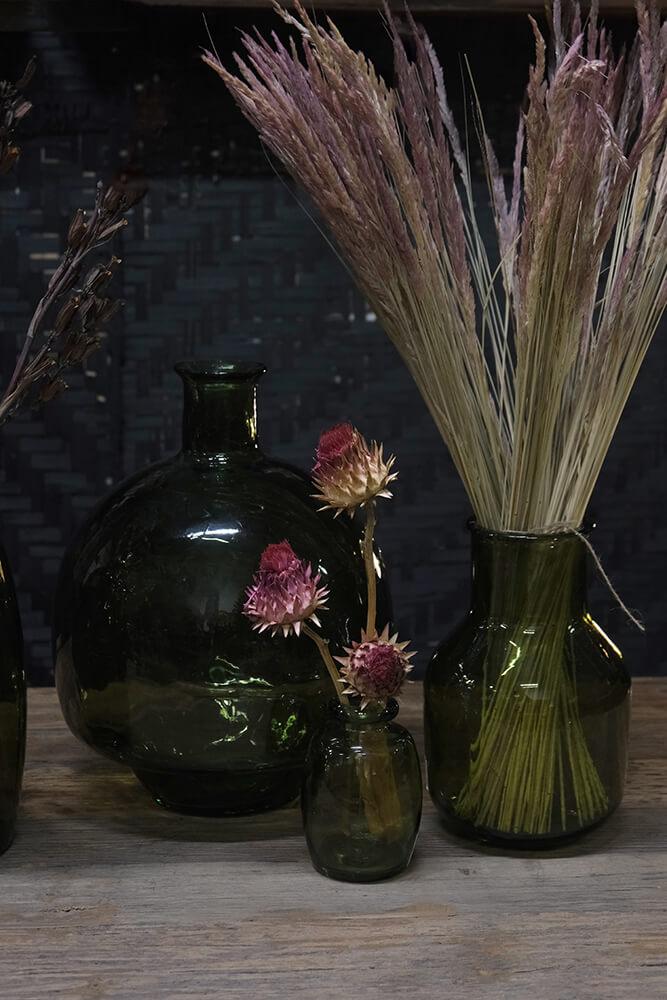 Wunderschöne olivgrüne Glasvase aus recyceltem Glas für alles von duftenden Lieblingsblumen bis hin zu dekorativen Zweigen. Sie können die Vase ganz einfach allein stellen oder als rohen Kerzenständer als dekoratives Element in Ihrem Zuhause verwenden. Oder kombinieren Sie diese Vase mit mehreren Vasen im gleichen Farbton, mit getrockneten oder lebenden Blumen.