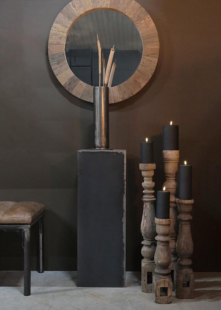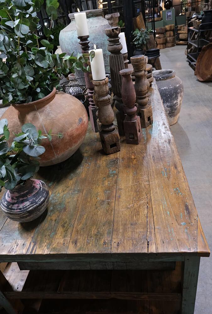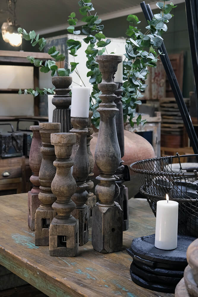 Beeindruckender Kerzenhalter aus alten Tischbeinen in XL-Größe. Dieser Kerzenhalter zeichnen sich durch ihre schönen Schnitzereien und ihr voluminöses Design aus. Mit ihrer XL-Größe verleihen diese Kerzenhalter jedem Raum eine auffällige und majestätische Atmosphäre. Platzieren Sie diese Kerzenhalter als zentrale Dekoobjekte auf Ihrem Tisch, Ihrem Kamin oder an anderen prominenten Stellen in Ihrem Zuhause. Sie werden garantiert eine außergewöhnliche Schönheit und Atmosphäre in Ihre Einrichtung bringen. Sie sind zwischen 70 und 90 cm hoch.