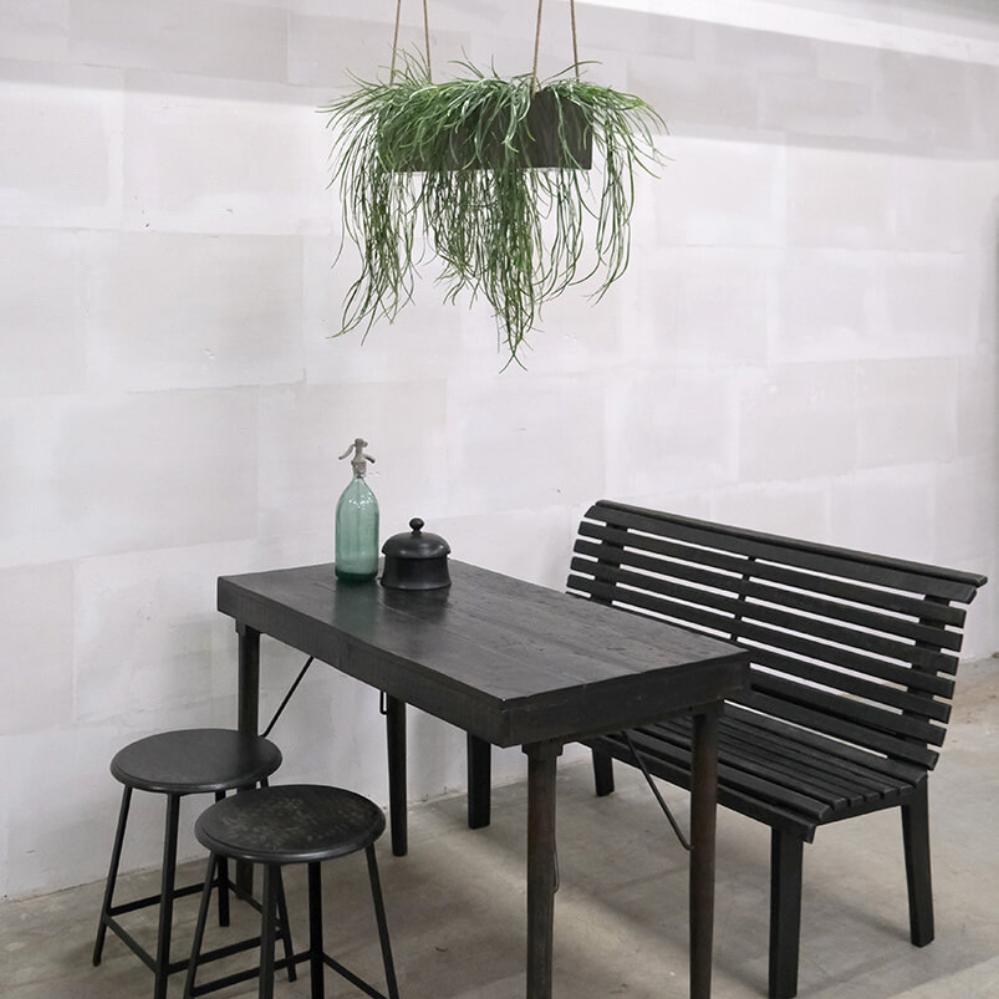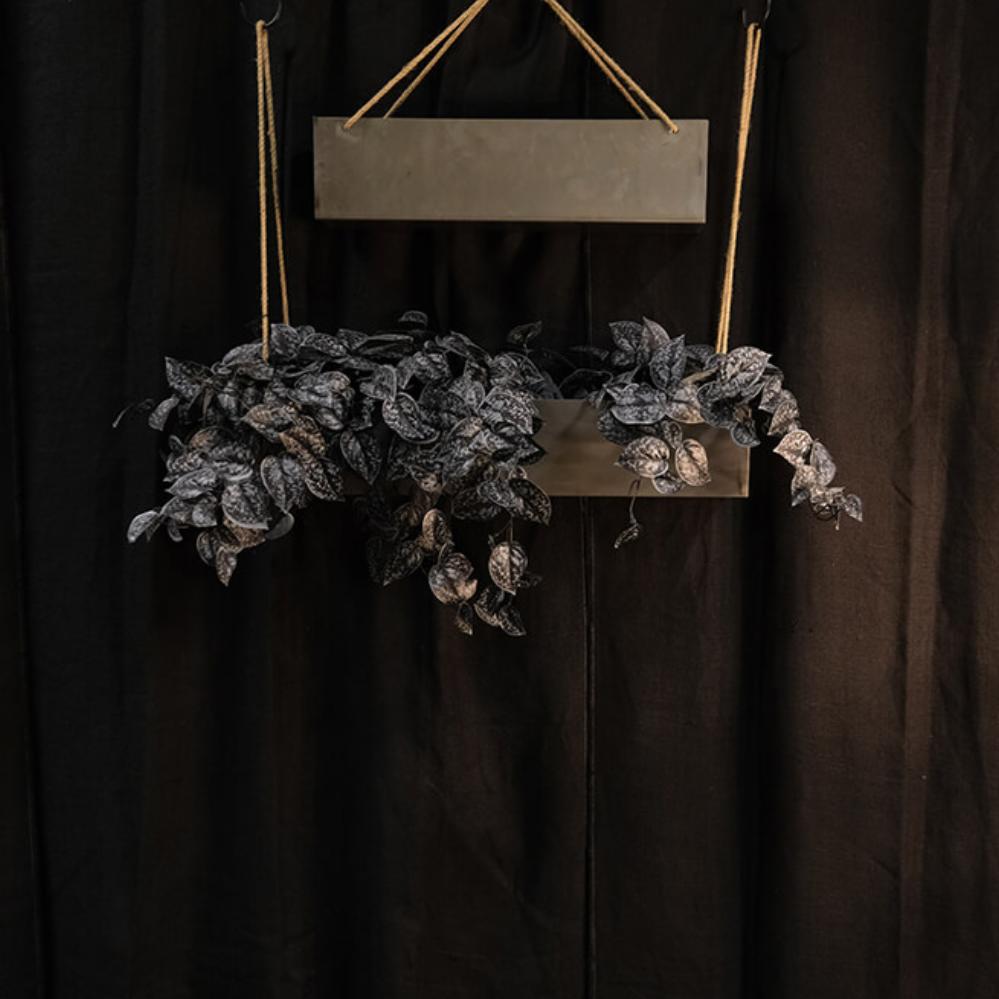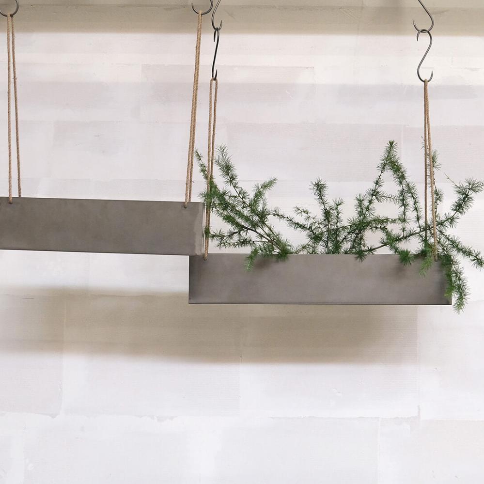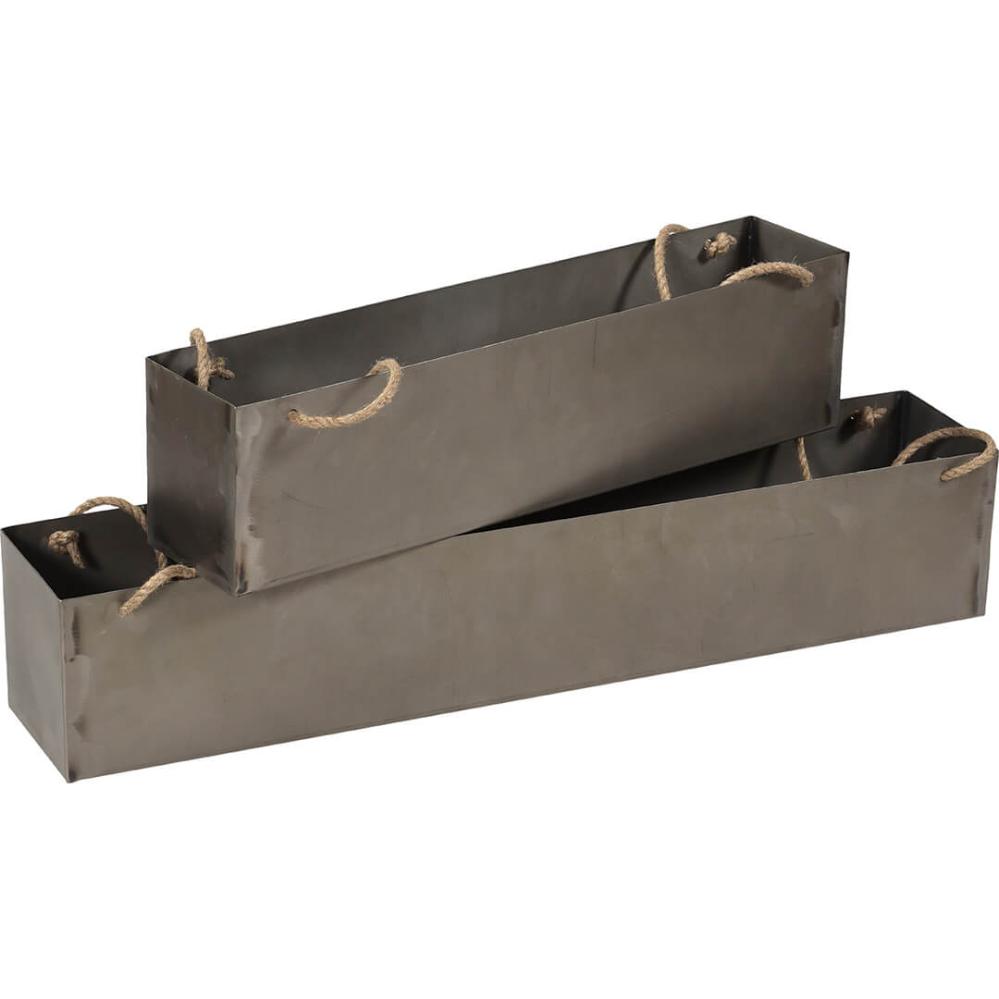 Ein 2er-Set Pflanzkästen bestehend aus zwei rechteckigen Kästen in rohem Design. Die Pflanzkästen sind aus Eisenblech und an beiden Seiten jedes Pflanzkastens mit Seilen zum Aufhängen befestigt. Schaffen Sie eine natürliche Atmosphäre mit Pflanzen, die von der Decke oder von der Wand herabhängen. Sie können auch die Kästen als einzigartige und kreative Champagnerkühler verwenden, die über dem Tisch in Ihrem Café oder Restaurant hängen. Es ist wichtig, dass Sie eine Art Einsatz in die Pflanzkästen verwenden, da sie nicht wasserdicht sind. Groß: H: 15cm x B: 80cm x T: 15cm Klein: H: 15cm x B: 60cm x T: 12cm