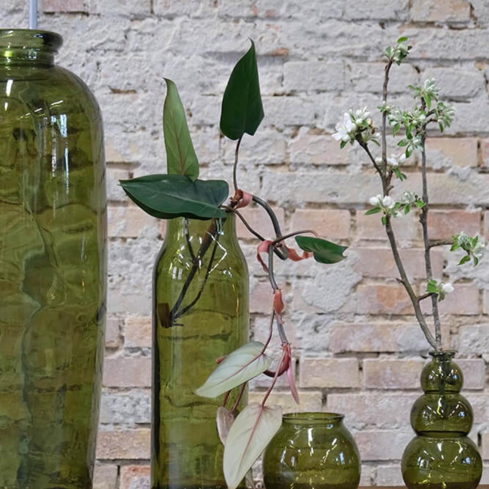 Die Winslet Vase aus olivgrünem, recyceltem Glas hat eine weiche, runde Form und einen gedämpften Grünton, der natürliche Ruhe und rauen Stil ausstrahlt. Die Farbe erinnert an Waldboden und frische Triebe. In Kombination mit dem recycelten Glas entsteht ein lebendiger Ausdruck mit kleinen Unregelmäßigkeiten und Bläschen, die die Vase besonders authentisch machen. Perfekt in Kombination mit Holz, Eisen und dunklen Textilien. Setzen Sie sie als kleine grüne Pause in der Einrichtung ein – auf der Fensterbank, auf dem Restauranttisch oder als Teil eines größeren Arrangements mit Vasen in verschiedenen Farben und Höhen.